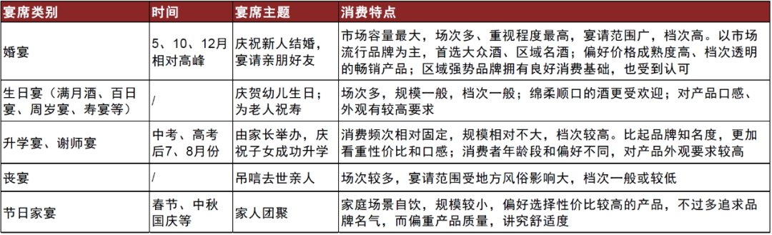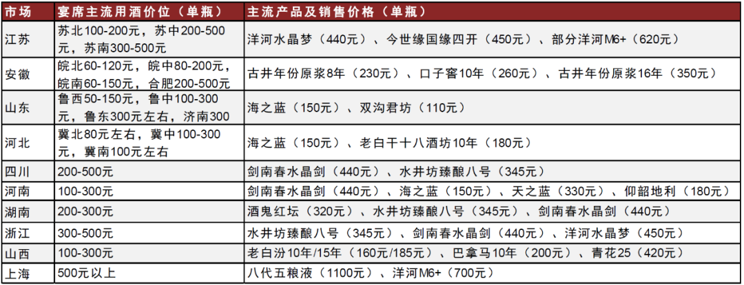 实际上,宴席市场覆盖广阔,通常包括婚宴、寿宴、满月宴、升学宴、庆功宴、家宴等,不同的宴席场景对白酒的需求不一样。其中,婚宴为典型代表,用酒注重品牌知名度,消费水平相对较高;而生日宴、家宴等规模相对较小,更注重产品口感和性价比。以安徽合肥市场为例,生日宴以百元档古5为主,婚宴则以更贵的古8或古16为主。又如山东滕州市场,大众婚宴用酒基本以200元价位的泸州老窖窖龄30年为主,不同的宴席在价位选择上存在很大的差异。