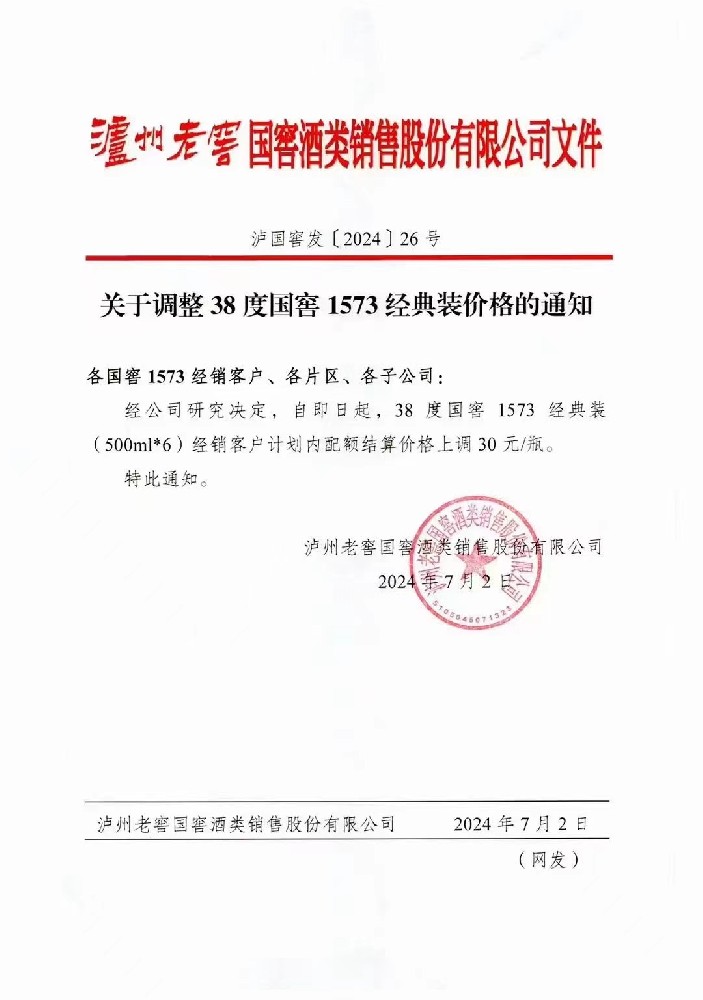 7月2日,泸州老窖国窖酒类销售股份有限公司发布通知称,自即日起,38度国窖1573经典装( 500ml*6)经销客户计划内配额结算价格上调30元/瓶。