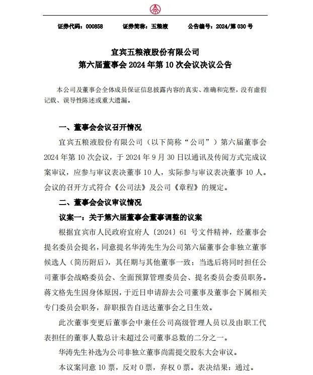 10月7日,宜宾五粮液股份有限公司发布第六届董事会2024年第10次会议决议公告。公告审议了关于第六届董事会董事调整的议案以及关于公司高级管理人员调整的议案。公告称,根据宜宾市人民政府宜府人〔2024〕61号文件精神,经董事会提名委员会提名,同意提名华涛为公司第六届董事会非独立董事候选人,其任期与其他董事一致