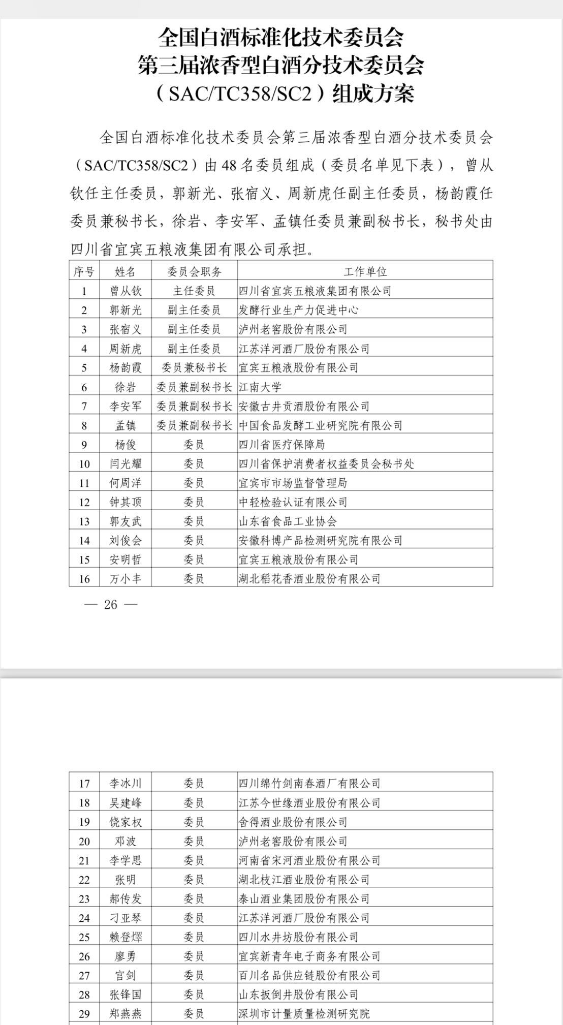 全国白酒标准化技术委员会第三届浓香型白酒分技术委员会(SAC/TC358/SC2)(下称“第三届浓香标委会”)由 48 名委员组成。曾从钦任主任委员,郭新光、张宿义、周新虎任副主任委员,杨韵霞任委员兼秘书长,徐岩、李安军、孟镇任委员兼副秘书长,秘书处由四川省宜宾五粮液集团有限公司承担。