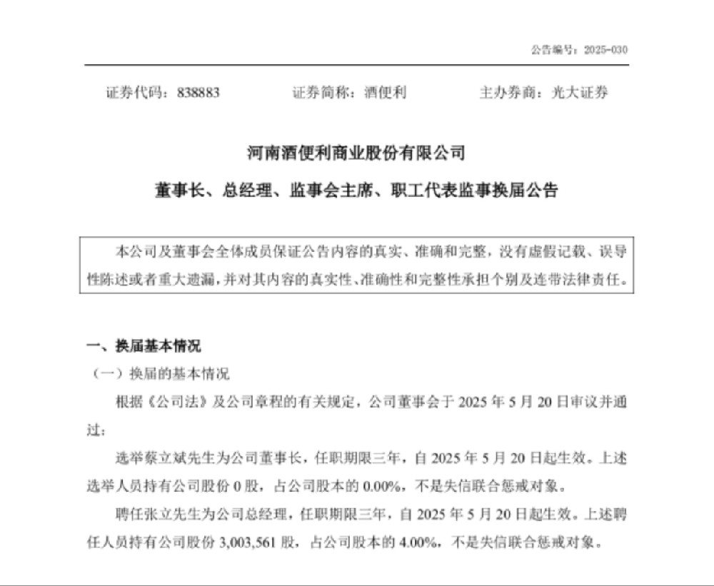 5月21日,河南酒便利商业股份有限公司发布换届公告。根据公告,选举蔡立斌为公司董事长,任职期限三年;聘任张立为公司总经理,任职期限三年。