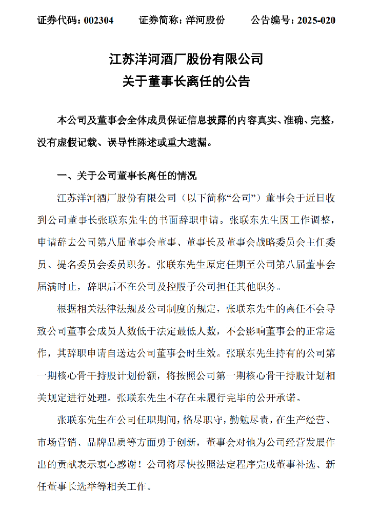 7月1日,江苏洋河酒厂股份有限公司发布《关于董事长离任的公告》称,董事会于近日收到公司董事长张联东的书面辞职申请。张联东因工作调整,申请辞去公司第八届董事会董事、董事长及董事会战略委员会主任委员、提名委员会委员职务。张联东原定任期至公司第八届董事会届满时止,辞职后不在公司及控股子公司担任其他职务。