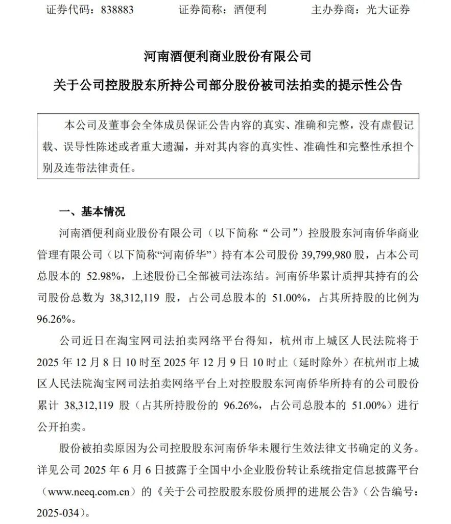 河南酒类流通连锁龙头酒便利,或将迎来全新的“白衣骑士”。11月10日,酒便利发布《关于公司控股股东所持公司部分股权被司法拍卖》的提示性公告。根据公告,因控股股东河南侨华商业管理有限公司(以下简称“河南侨华”)未履行生效法律文书确定的义务,杭州市上城区人民法院将对其持有酒便利3831.21万股(占酒便