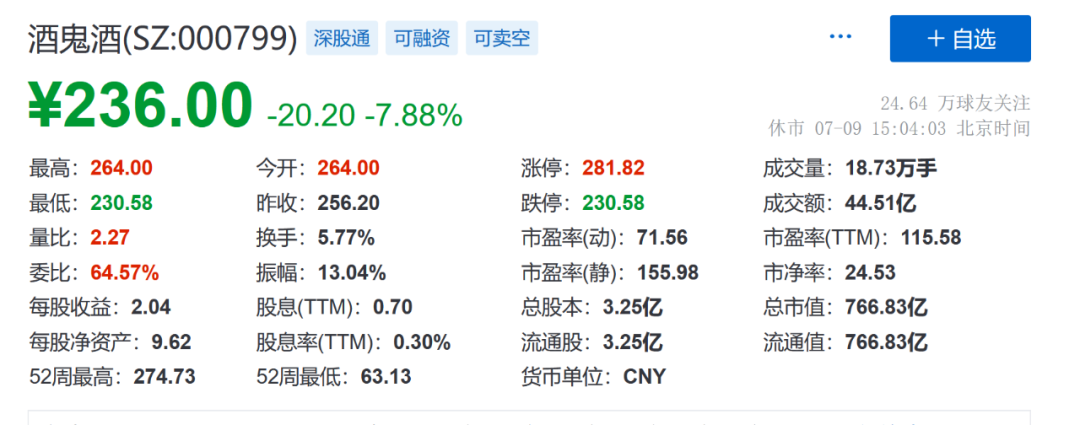 因此,7月8日晚间,股民欢腾了,都在盼着第二天股价有一个惊艳的表现,并提振整个白酒板块,可是天意弄人,7月9日开盘之后,酒鬼酒的股价不仅没有上涨,反而还在大跌,够“惊吓”的,盘中一度触及跌停,截至7月9日收盘,酒鬼酒的股价跌幅在7.88%左右。