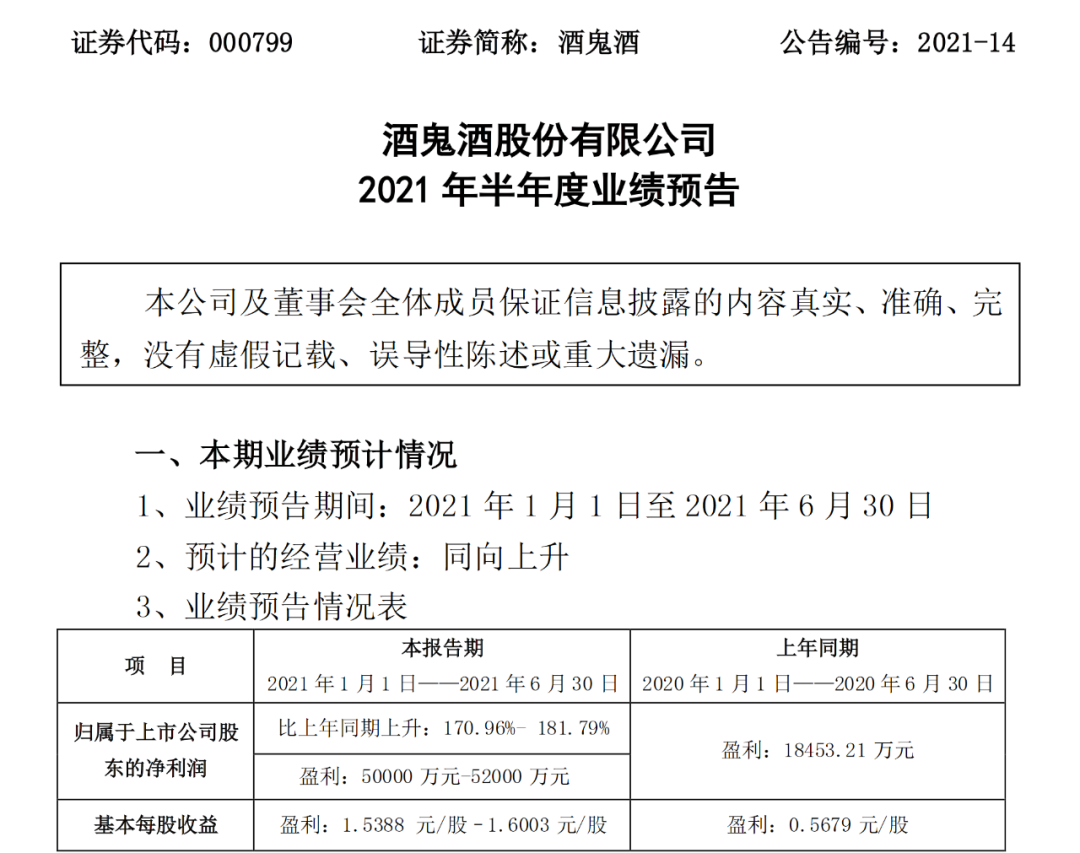 7月8日晚间,酒鬼酒公开了2021年半年度业绩预告,归属于上市公司股东的净利润约为5亿元到5.2亿元,与2020年上半年不到1.85亿元,增幅在170%-182%之间。