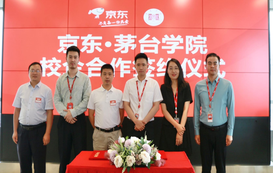 2021年7月16日,京东与茅台学院校企合作签约仪式在京东北京总部举行。京东零售集团消费品事业部酒类采销部总经理路达,京东集团大商超全渠道HRBP部负责人连欢欢,京东集团零售学院