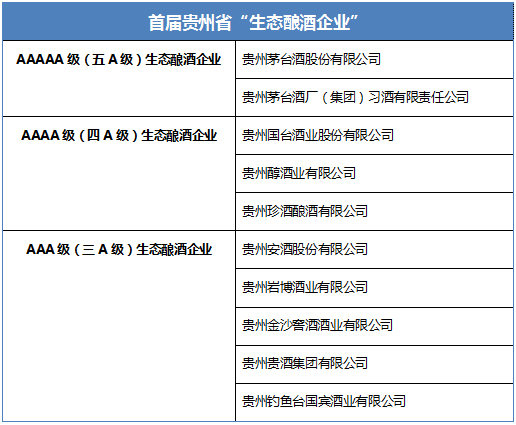 其中,贵州茅台酒股份有限公司、贵州茅台酒厂(集团)习酒有限责任公司获得5A级“生态酿酒企业”考评认证;贵州国台酒业股份有限公司、贵州醇酒业有限公司、贵州珍酒酿酒有限公司获4A级考评认证;贵州安酒股份有限公司、贵州岩博酒业有限公司、贵州金沙窖酒酒业有限公司、贵州贵酒集团有限公司、贵州钓鱼台国宾酒业有限公司获3A级考评认证。