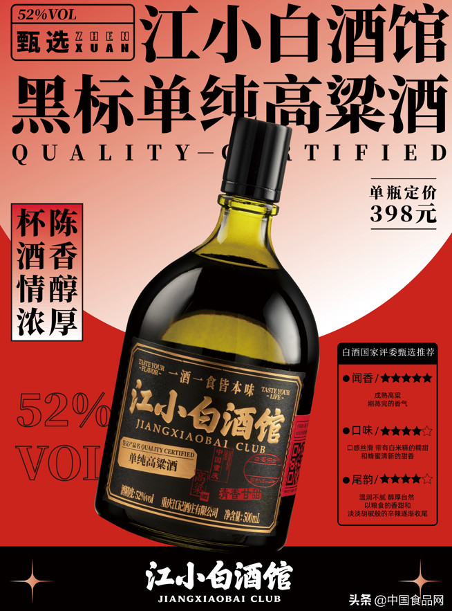 侍酒师解释,黑标52是经品酒师、美食家及用户共同甄选出来的优质佐餐酒。在原始店10万用户的反馈记录中,清香甘甜又不失醇厚的52度单纯高粱酒天然具有“酒不压菜味”的特点,是最受欢迎的。