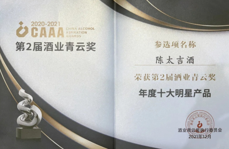 陈太吉酒荣获中国酒业青云奖“年度十大明星产品”