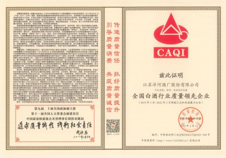 凭借绵柔品质以及良好的市场口碑,洋河股份荣获中国质量检验协会颁发的四项证书:“全国产品和服务质量诚信示范企业”、“全国质量检验稳定合格产品”、“全国白酒行业质量领先品牌”、“全国白酒行业质量领先企业”。