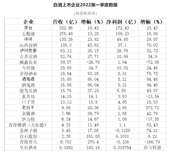 一年一度的年报季完美收官,有喜有忧。与2021年相比,2022年的酒业整体走势波动巨大,甚至多数白酒股回撤幅度已经高过历年。唯有茅台一季报盈利超预期,贵州茅台披露一季报称,当季营业收入322.96亿元,同比增长18.43%;净利润172.45亿元,增长23.58%,每日净赚1.92亿。公司此前披露一季度主要经营数据预计,一季度营业总收入331亿元左右,同比增长18%左右;净利润166亿元左右,同比增长19%左右。
