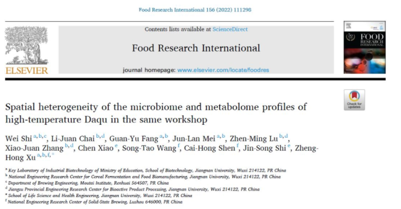 近日,江南大学许正宏教授团队与国家固态酿造工程技术研究中心沈才洪正高工团队联合在国际食品科技专业TOP期刊《Food Research International》(IF:6.475)上发表了题为Spatial heterogeneity