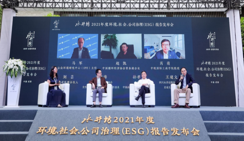 圆桌讨论环节中,公众环境研究中心(IPE)主任马军、中国循环经济协会常务副会长赵凯、中国电子节能技术协会全生命周期绿色管理专委会主任委员王洪涛、南方周末中国企业社会责任研究中心主任孙孝文,分别从各自领域的专业角度进一步梳理了中国白酒行业目前面临的核心ESG风险及机遇,并对进一步提升行业ESG管理水平提出了各自建设性的意见。在此基础上,中欧国际工商学院芮萌教授结合中欧商学院正在开展的全球蒸馏酒行业ESG评价体系的研究进展,对白酒行业产生关键影响的ESG指标进行了总结分享。此外,水井坊首席生产运营官王建文重点就水井坊的生产运营环节,介绍了所识别的ESG风险,并以水井坊邛崃全产业链基地项目为例,展示了公司在环境健康安全管理方面取得的显著成效。