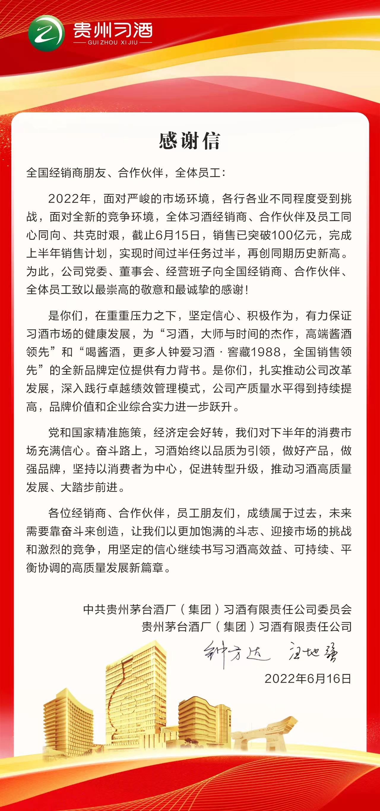 2022年6月16日,贵州茅台酒厂(集团)习酒有限责任公司发布《致习酒全国经销商、合作伙伴,全体员工的感谢信》,信中披露截止6月15日,习酒今年销售额已突破百亿,实现时间过半任