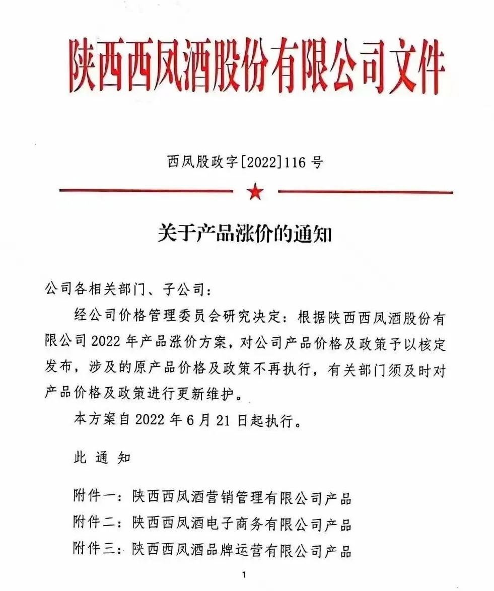 今日,陕西西凤酒股份有限公司发布《关于产品涨价的通知》。通知显示,根据陕西西凤酒股份有限公司2022年产品涨价方案,对公司产品价格及政策予以核定发布,涉及的原产品价格及
