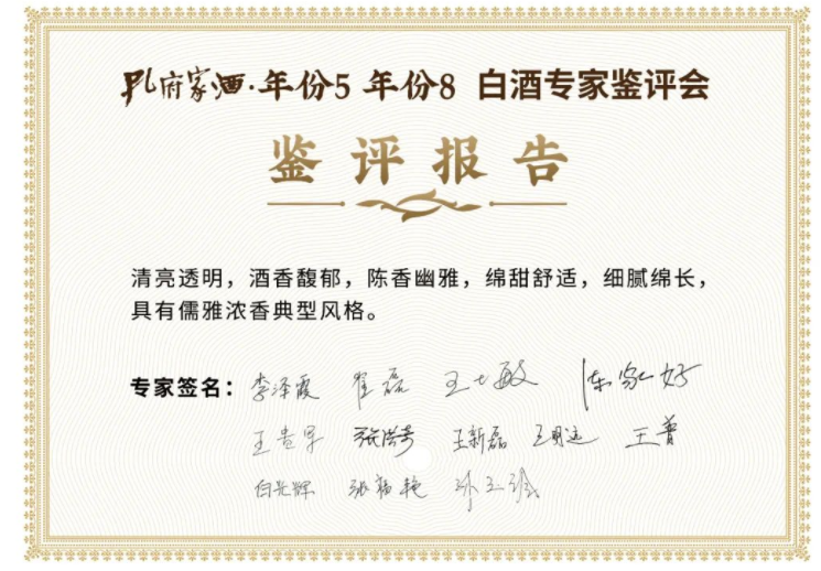 据了解,在真年份系列上市前,孔府家邀请了12位国家级白酒评委对新产品进行鉴评。参加此次鉴评的专家包含了中国白酒品酒大师、国家级白酒评委李泽霞,中国白酒品酒大师、国家级白酒评委崔磊,国家级白酒评委王士敏,国家级白酒评委王贵军,国家级白酒评委张洪奇等。专家鉴评团队阵容强大,专业素质与经验毋庸置疑,围绕真年份系列酒体的“色”、“香”、“味”、“格”等方面进行严格品鉴,对两款产品品质给予了一致赞赏。最终,12位专家联名得出鉴评结论:清亮透明,酒香馥郁,陈香幽雅,绵甜舒适,细腻绵长,具有儒雅浓香典型风格。